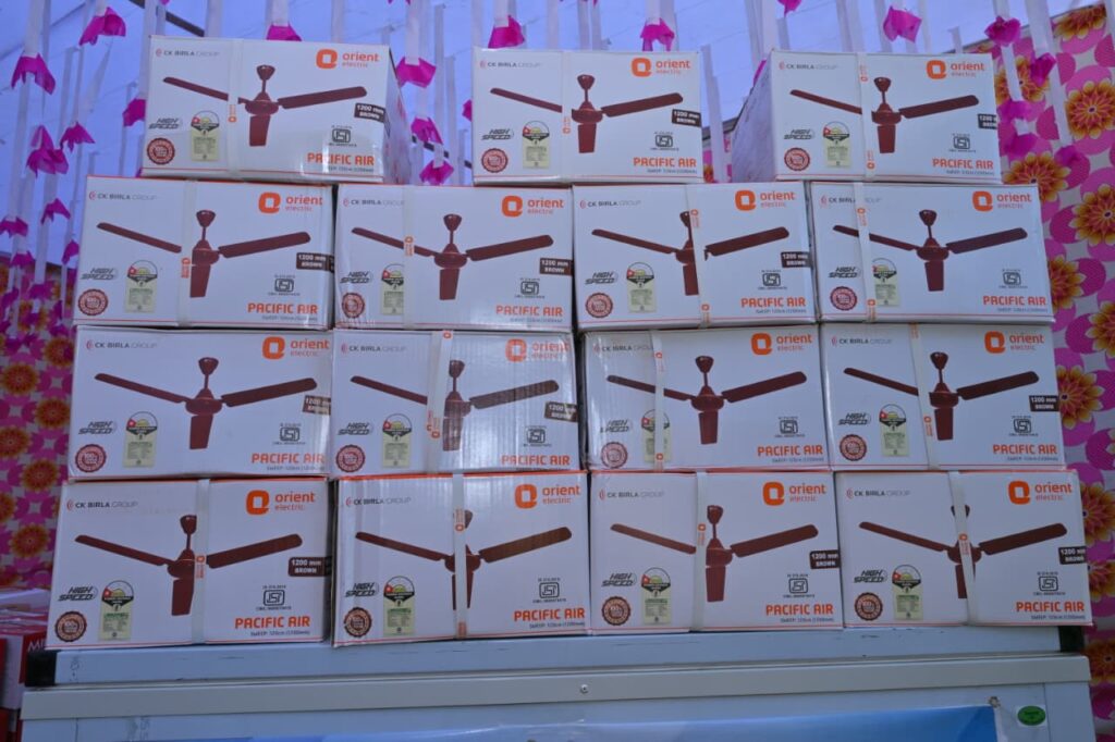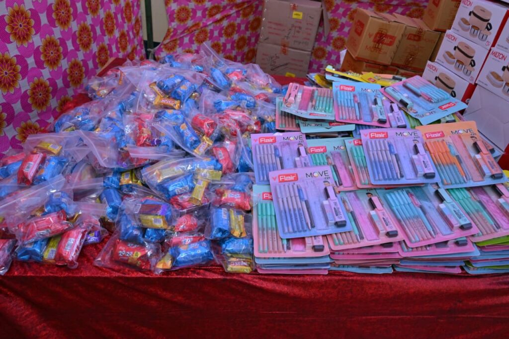 बड़ा वाटर कूलर, 16 पंखे, विद्यालय विकास हेतु फर्नीचर के साथ ही 450 विद्यार्थियों को टिफ़िन बॉक्स ,स्टेशनरी किट एवं चॉक्लेटस,बिस्कुट का वितरण।