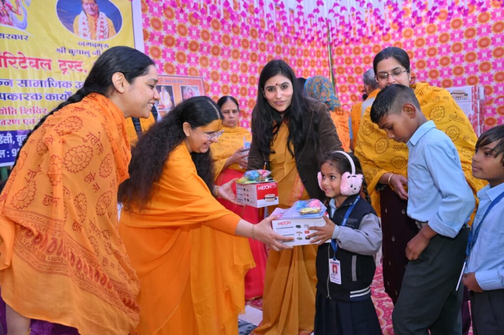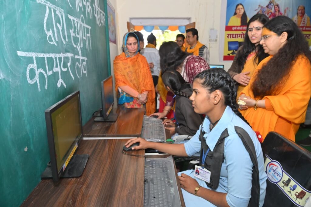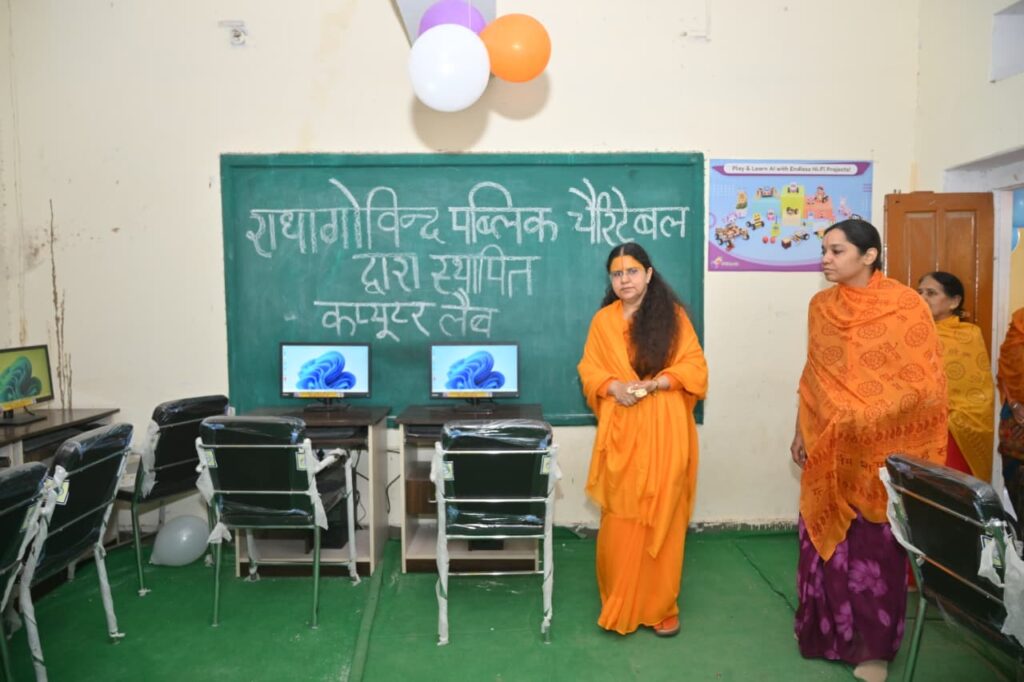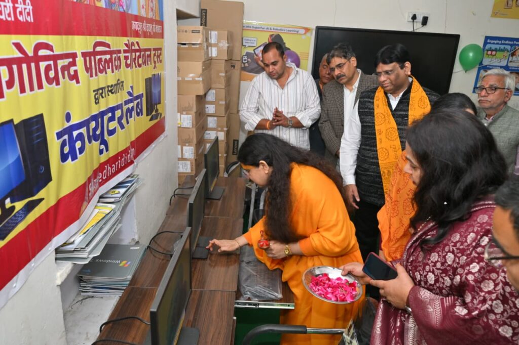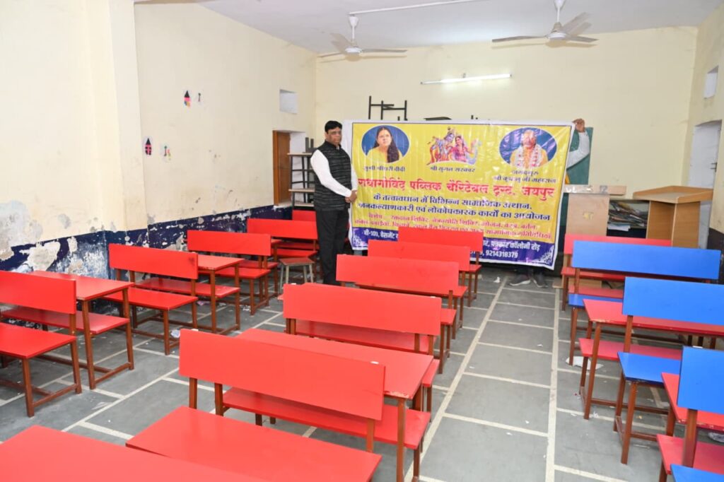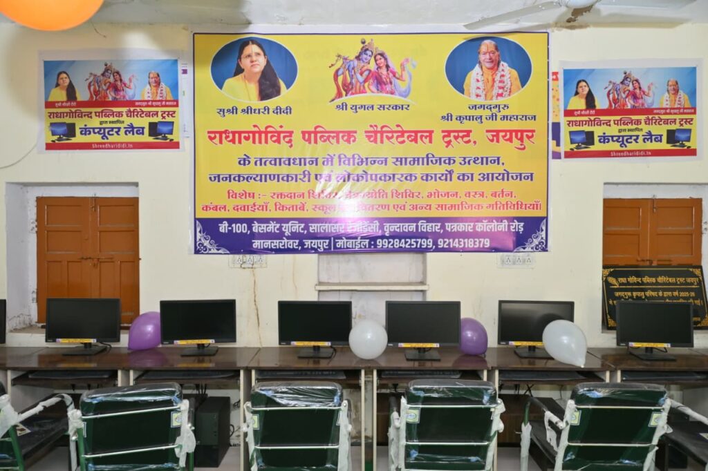 जयपुर : जगद्गुरु श्री कृपालु जी महाराज की प्रचारिका सुश्री श्रीधरी दीदी की अध्यक्षता में संचालित राधागोविन्द पब्लिक चैरिटेबल ट्रस्ट, जयपुर द्वारा नेवटा स्थित राजकीय उच्च माध्यमिक विद्यालय में14 कंप्यूटर, कंप्यूटर टेबल, चेयर्स सहित कंप्यूटर लैब की स्थापना की गयी है, साथ ही एक लाइब्रेरी का भी सेटअप ट्रस्ट द्वारा किया गया है, इसके साथ ही एक बड़े साइज का वाटर कूलर 150/400 लीटर कैपेसिटी का भी विद्यालय को भेंट किया गया, इसके अलावा विद्यालय इंफ्रास्ट्रक्चर को विकसित करने हेतु 16 छत वाले पंखे, दो बड़ी अलमारी, 4 ऑफिस टेबल, 4 बड़ी ऑफिस चेयर्स भी सप्रेम भेंट की गयी।इसके साथ ही 450 विद्यार्थियों को टिफ़िन बॉक्स, स्टेशनरी किट, एवं बिस्कुट चॉक्लेट इत्यादि सामान का वितरण भी किया गया।