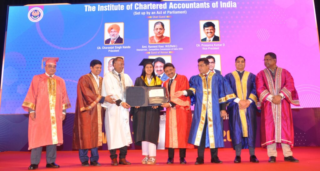 The Convocation ceremonies commenced concurrently across all centers, with Smt. Ravneet Kaur, Chairperson, Competition Commission of India (CCI), inaugurated the event as the Chief Guest from New Delhi. The New Delhi ceremony was led by CA. Charanjot Singh Nanda, President, ICAI and CA. Prasanna Kumar D, Vice-President, ICAI, in the august presence of Central Council Members—CA. Sanjay Kumar Agarwal, CA. (Dr) Sanjeev Kumar Singhal and CA. Hans Raj Chugh, along with CA. (Dr) Jai Kumar Batra, Secretary, ICAI.